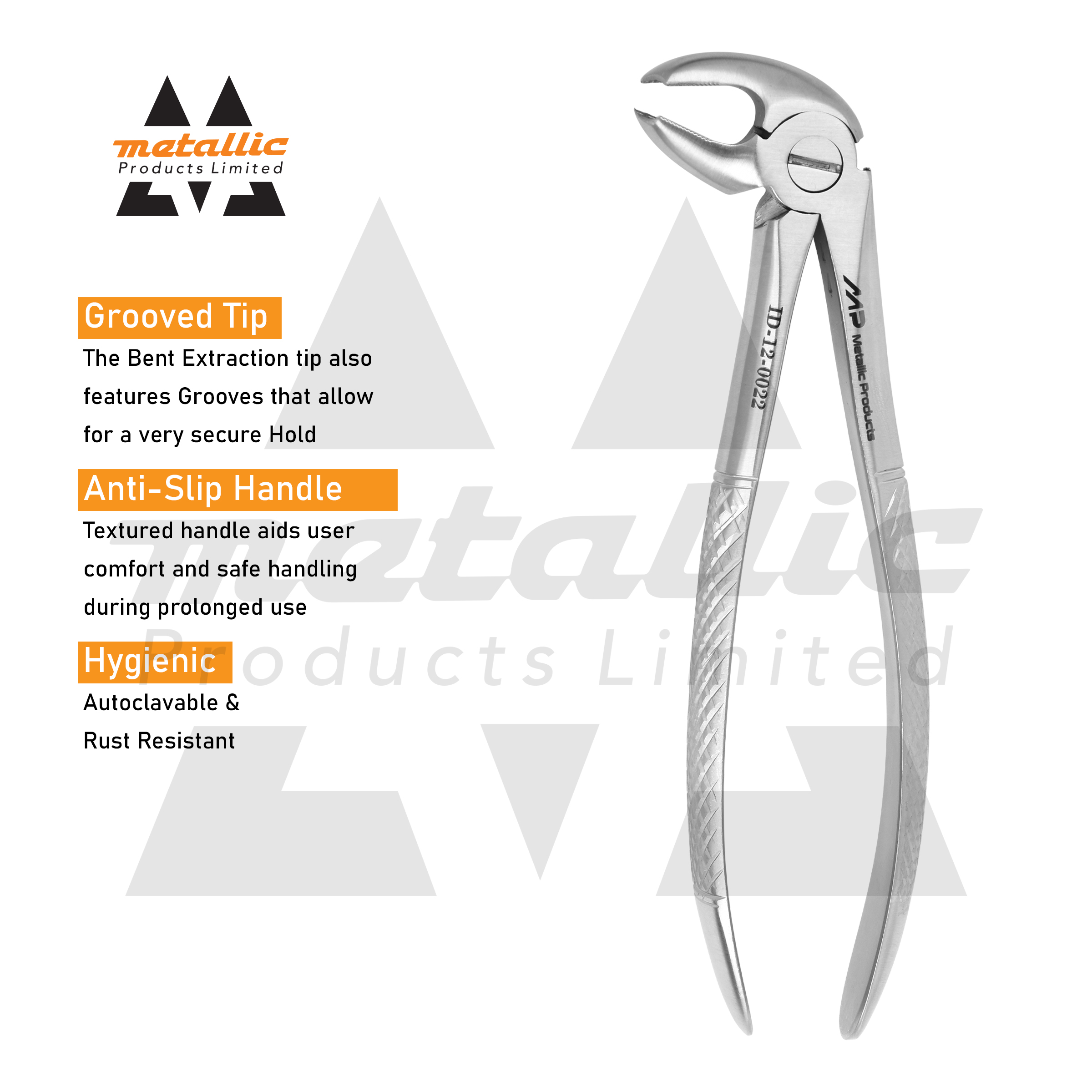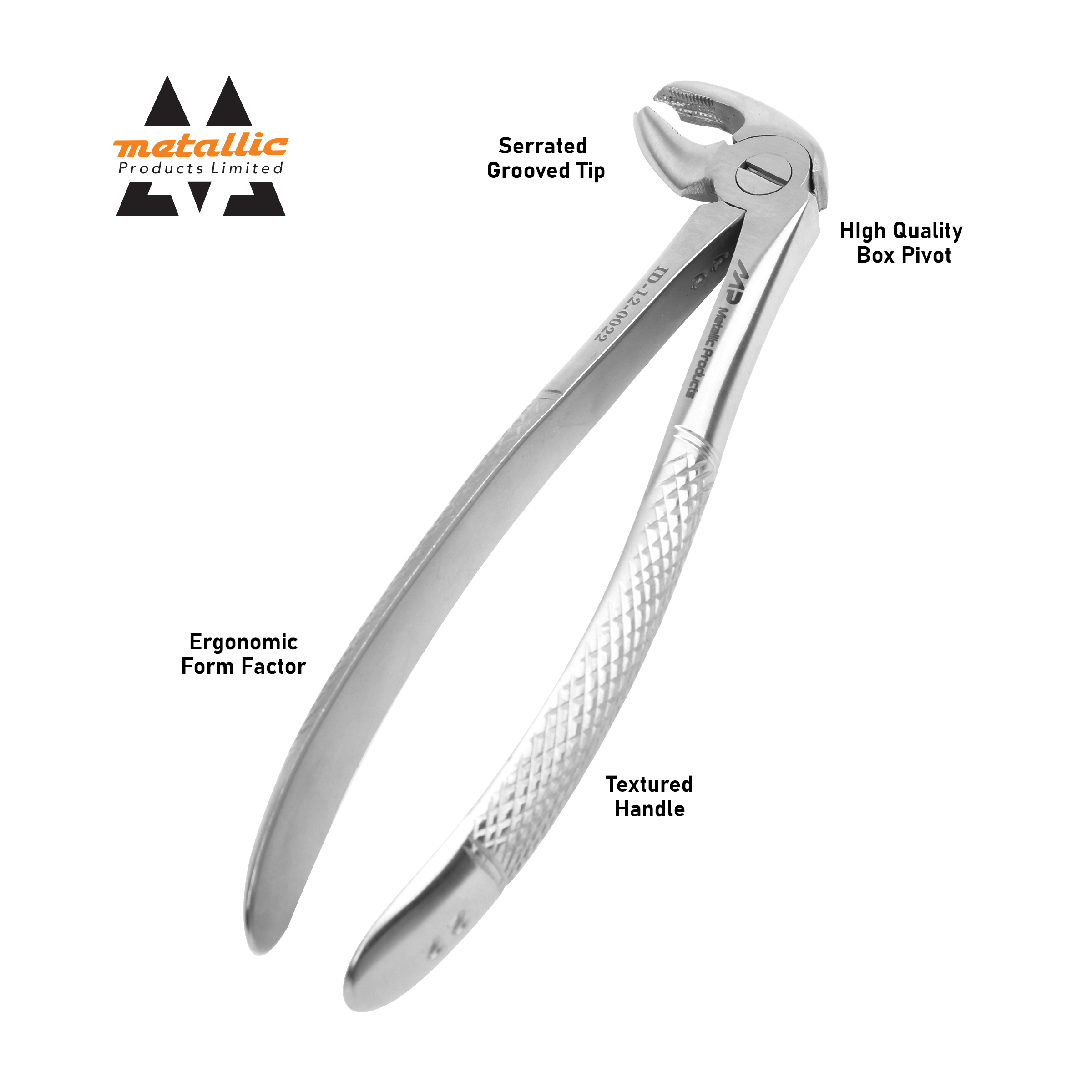 The Dental Extracting Forceps #22 – English Pattern Dull Finished by Metallic Products Limited is a precision-crafted dental extraction instrument designed for lower molars and premolars.