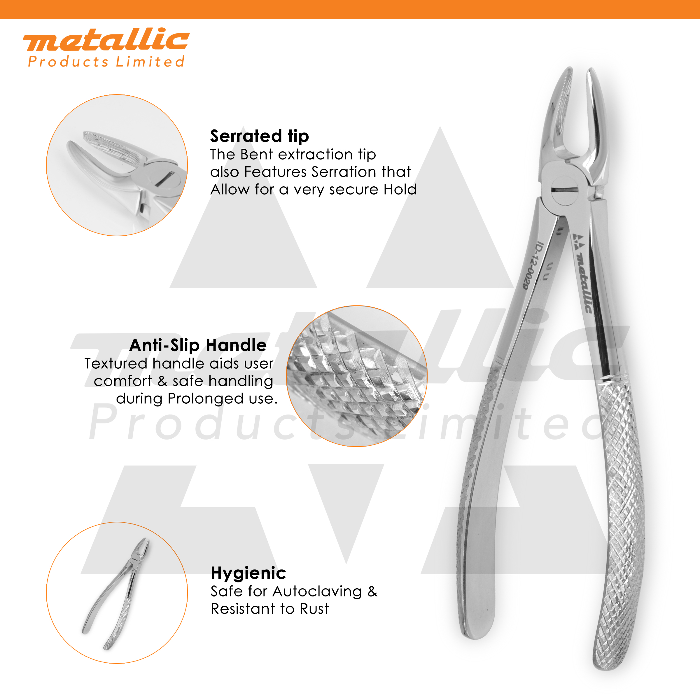 The Dental Extracting Forceps Fig. 29 by Metallic Products Limited is a professional-grade dental extraction instrument designed for upper incisors and root removal.