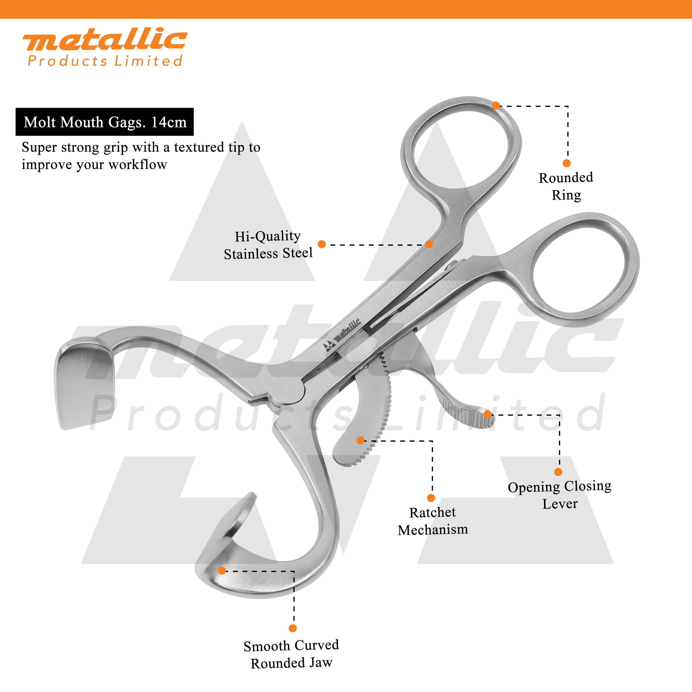 The Dental Molt Mouth Gag Oral Cheek Retractor Instruments – Adult 14cm by Metallic Products Limited is a precision-made instrument designed to hold the mouth open during dental, oral, and ENT procedures. Its spring-action retractor mechanism allows for controlled mouth opening, improving visibility and access for the practitioner.