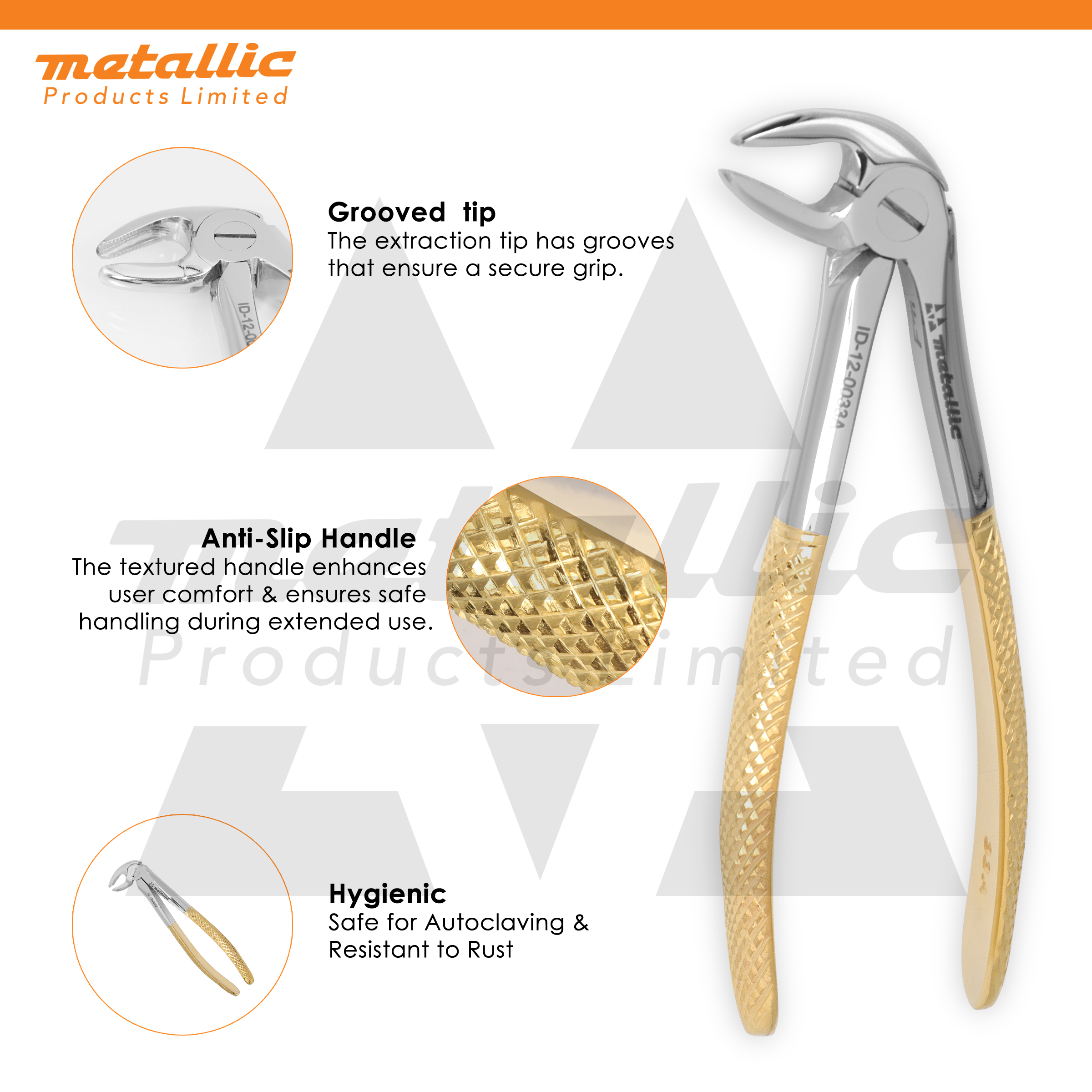 The Surgical Tooth Extracting Forceps Fig. 33A with Gold Plated Handle from Metallic Products Limited is a premium dental extraction tool designed specifically for lower jaw tooth removal.