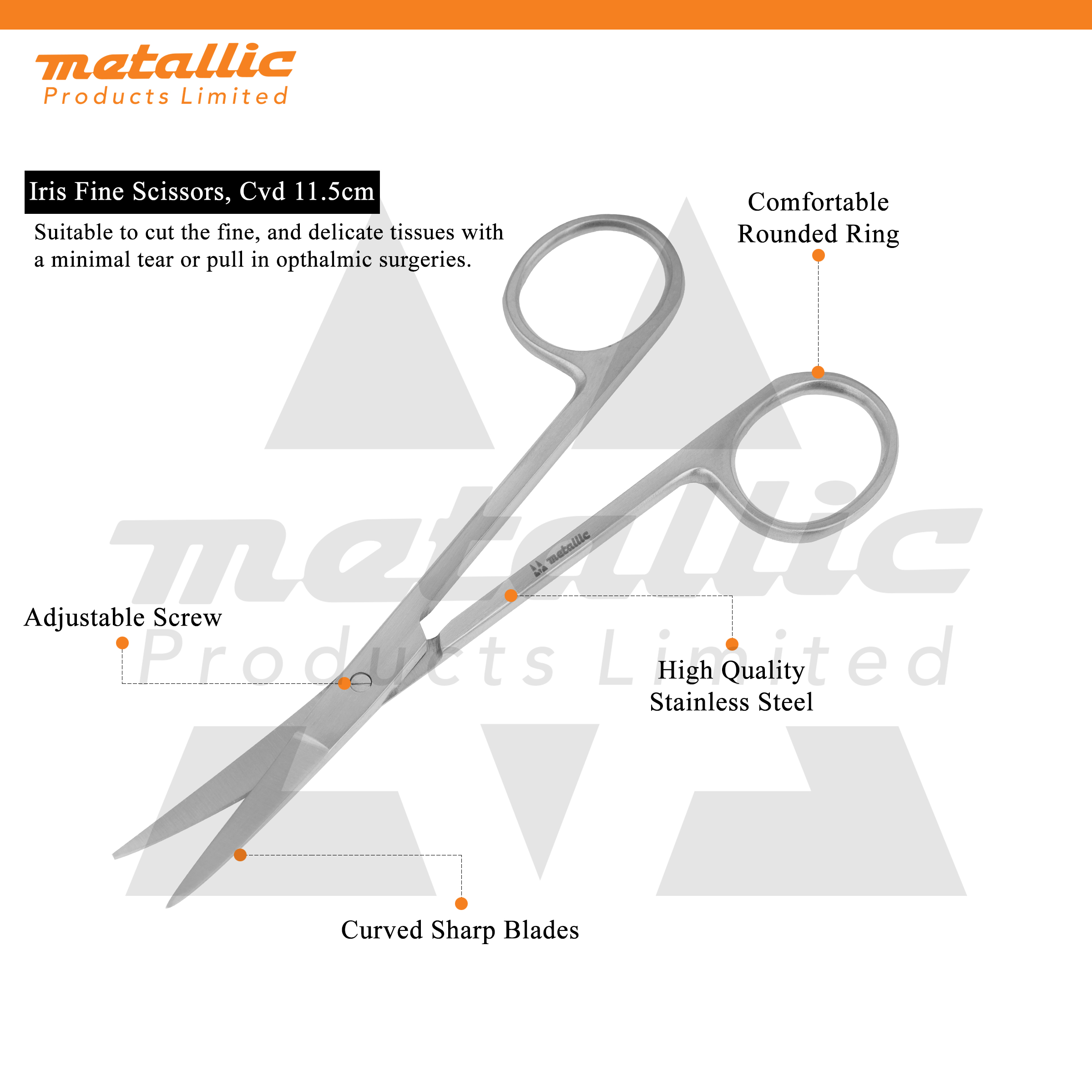 The Iris Scissors 11cm CVD are designed for precision cutting in delicate surgical and medical procedures. Featuring a curved-blade (CVD) design, they offer enhanced visibility, maneuverability, and control—making them ideal for ophthalmic, plastic, and microsurgical applications.