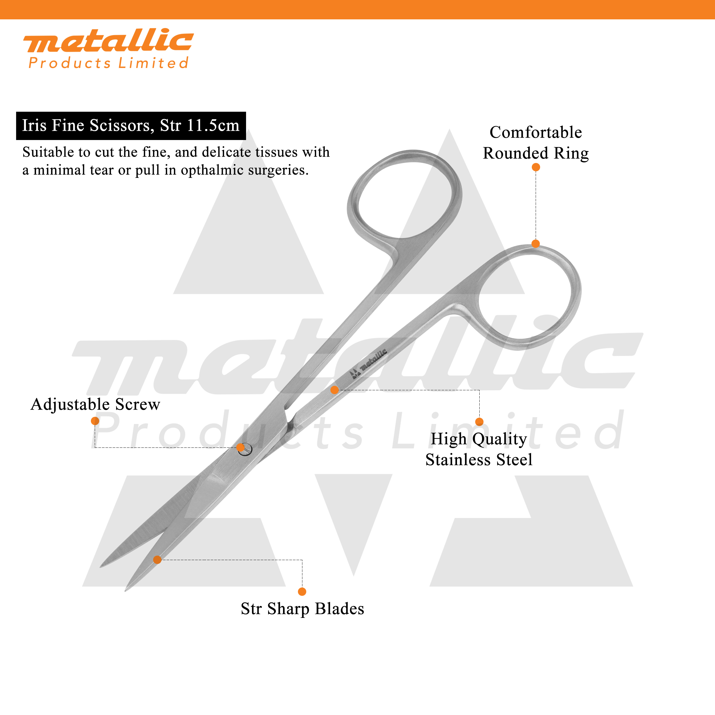 The Iris Scissors 11cm STR are a vital tool for fine, precise cutting in surgical, medical, and laboratory applications. With their straight-blade (STR) design, they deliver clean, controlled cuts, making them highly effective in ophthalmic, plastic, and microsurgical procedures.
