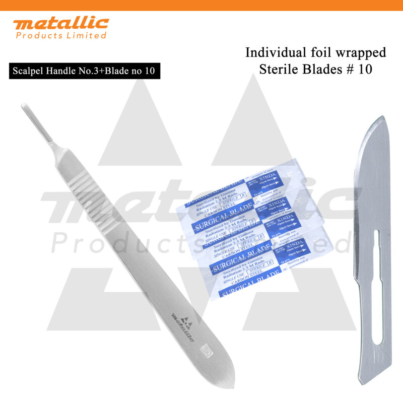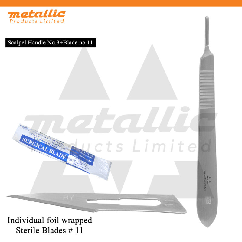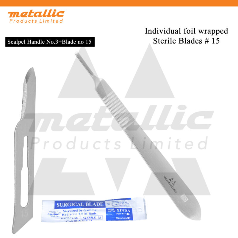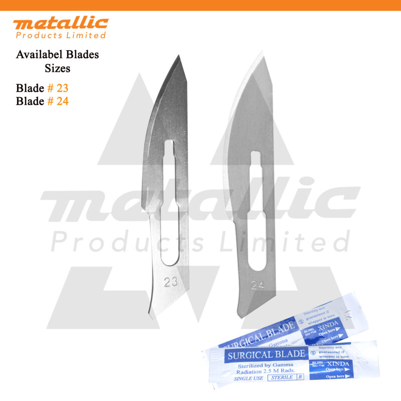 Metallic Products Limited provides a full range of Scalpel Handle No. 3 blades, including #10, #11, #12, #15, #23, and #24. We offer both 50 pcs and 100 pcs packs, all sterile and individually wrapped, with international shipping options available.